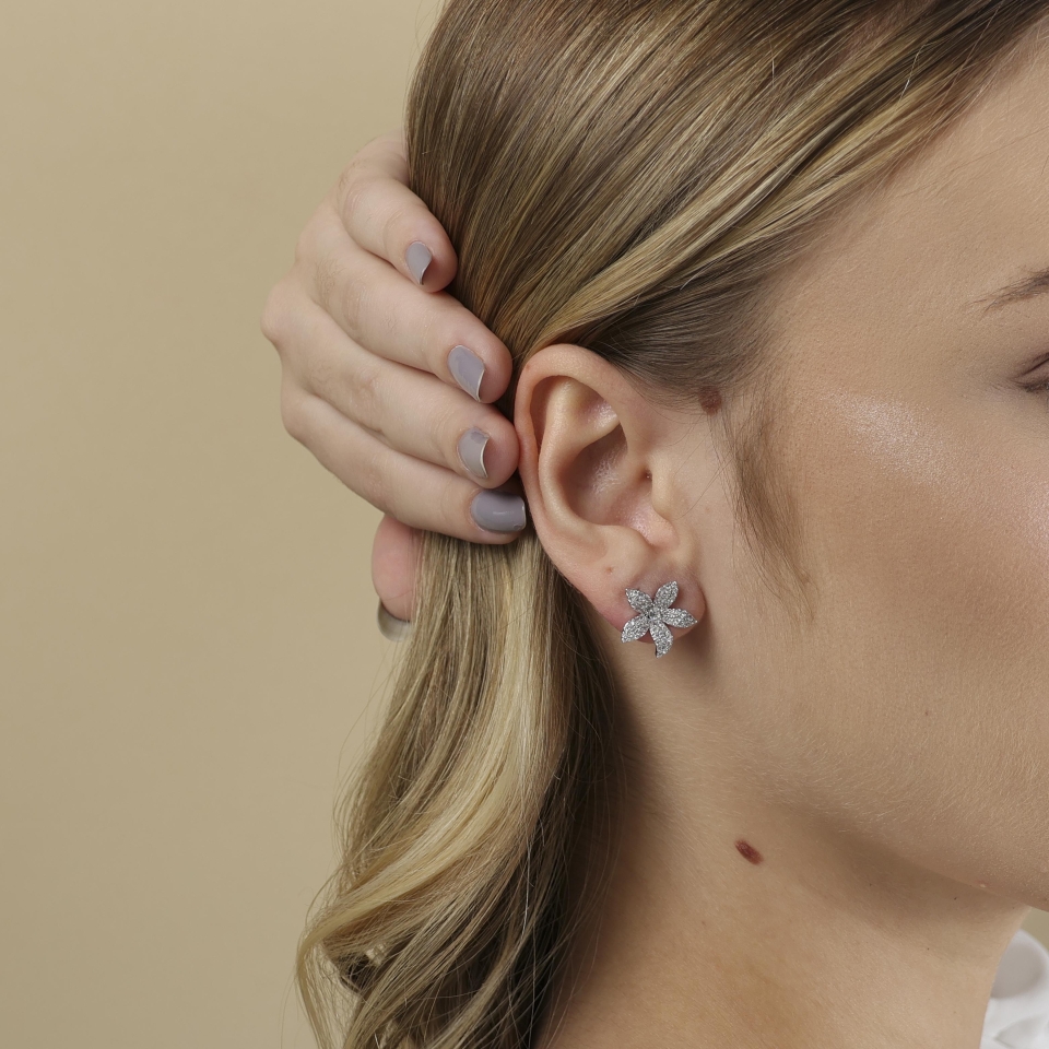 Um toque de natureza e elegância! O brinco flor é puro encanto, com pétalas levemente curvadas e totalmente cravejadas em zircônias, trazendo brilho e sofisticação na medida certa.